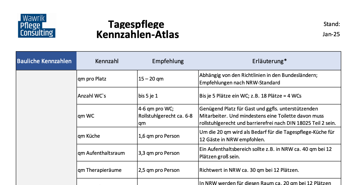 Diese und andere Fragen können mit dem neuen WPC Kennzahlenatlas 2025 für die Tagespflege beantwortet werden. Wir haben für Sie 31 praxisorientierte Kennzahlen für die Tagespflege in einer PDF zusammengetragen und in folgende Kategorien aufgeteilt: